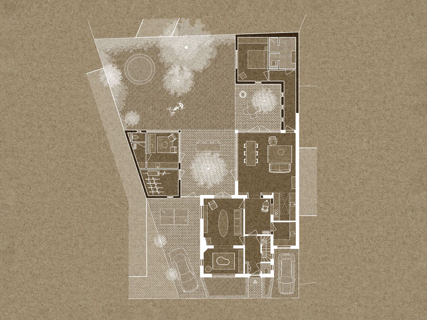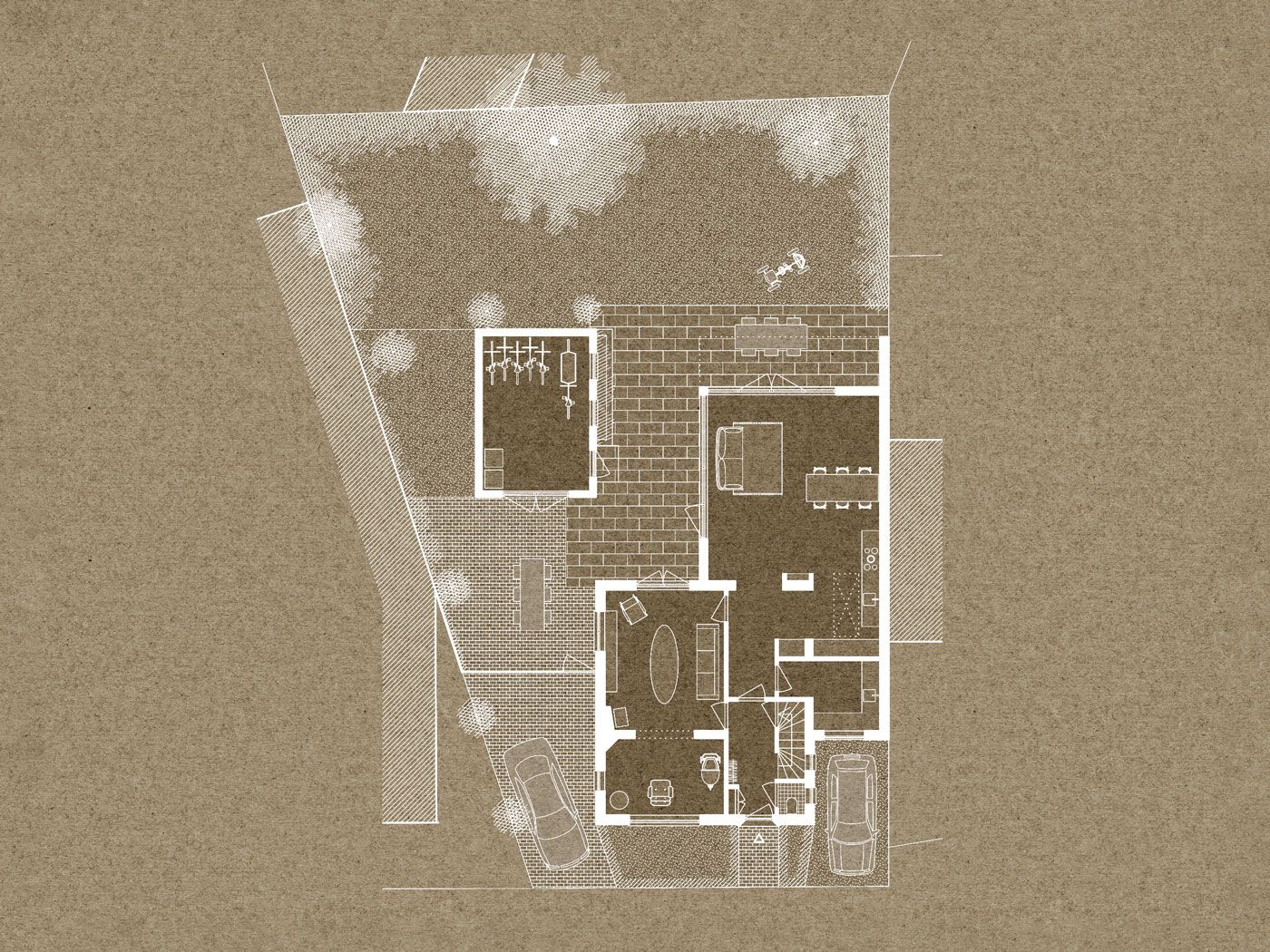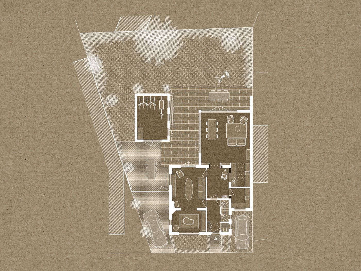 The study on LRS explores in three steps the optimization and extension of a suburban freestanding house for a growing family. The first step proposes a minimal interior alteration to optimize the use of existing spaces and to meet the demands of family life within the existing volume. The second step relocates the bicycle shed from the center of the garden to a new volume together with a multifunctional space. The new position on the side of the parcel offers space for a terrace adjacent to the kitchen, living room, the -newly built- multifunctional space and looks out over the garden. In the third step a bed-/bathroom combination is added in the far corner of the garden for optimal privacy. This volume defines a second 'garden room' adjacent to the living kitchen.